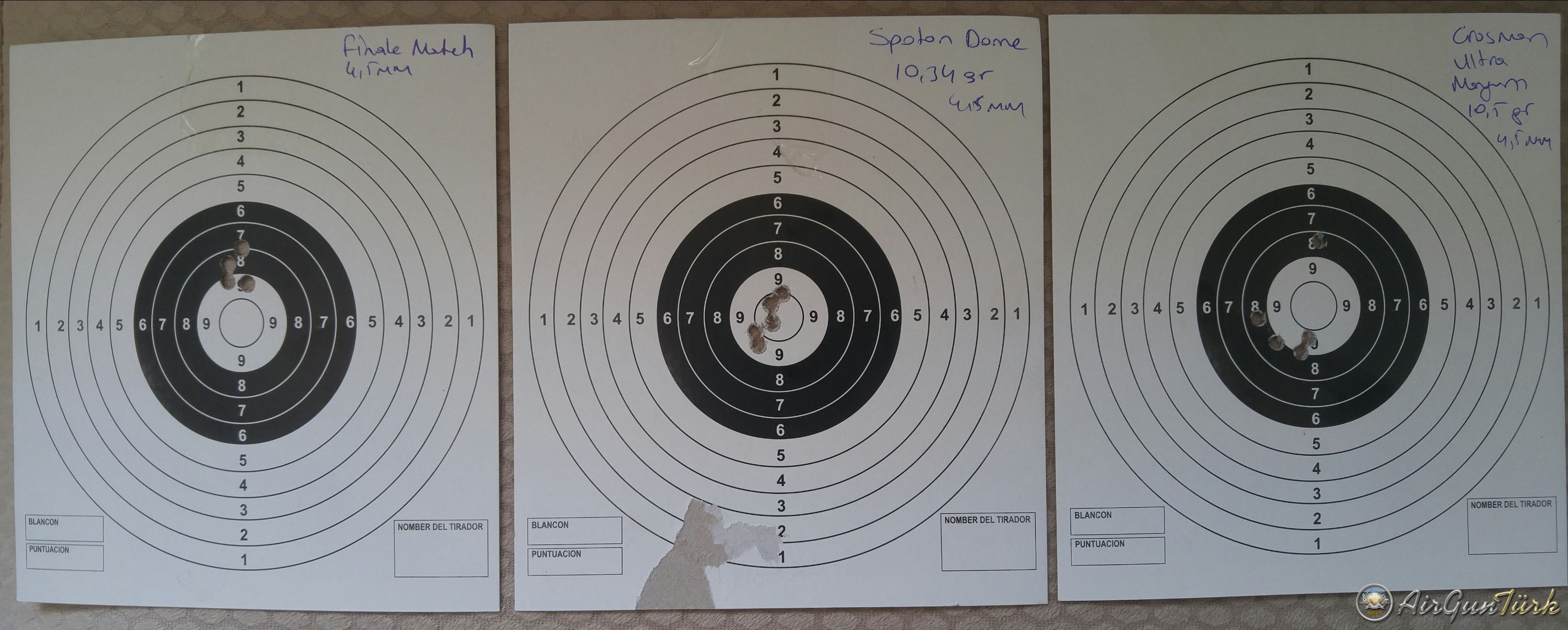 Atışlarda 3 çeşit pellet kullandım: Crosman Ultra Magnum 10,5gr, Spoton Dome 10,34gr ve Finale Match 4,5mm. Crosman ve Spoton aynı tip de pelletler olmakla birlikte Crosman ile daha dağınık bir grupman ortaya çıktı. Spoton'da gördüğüm önemli bir sorun şu oldu: Spoton pelletlerin bazıları diğerlerinden biraz daha küçük. Spoton pelletleri namluya parmağımla iterek yerleştirdiğim halde bazıları buna gerek kalmaksızın yerleşiyordu. Finale Match pelletler de namluya kolay girdi. Finale Match ve Spoton birbirine yakın sonuç vermekle beraber Finale Match biraz daha iyi gibi.