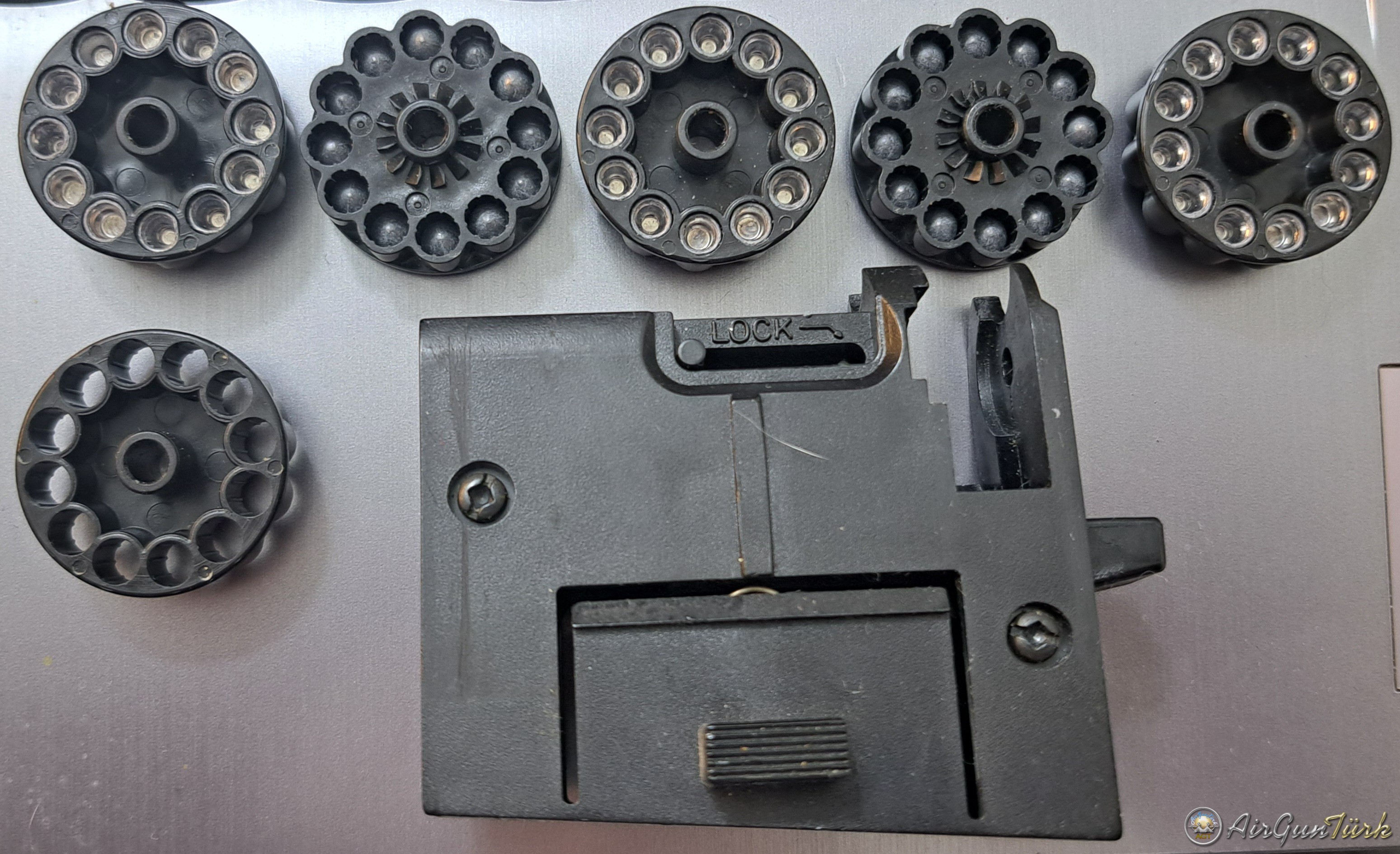 Crosman 1077 için 6 adet 12 x 4.5 mm pellet kapasiteli şarjör ve şarjör yuvası